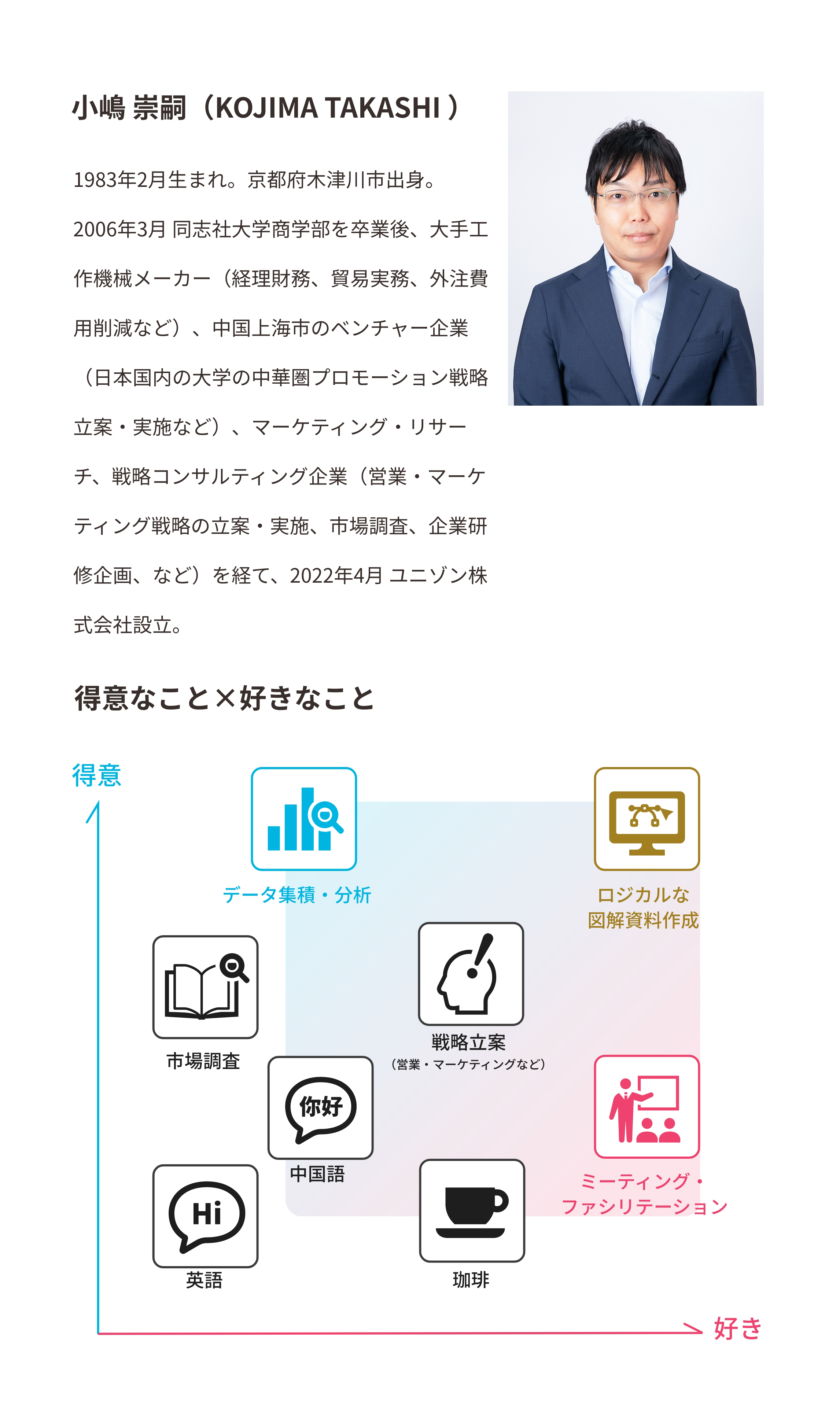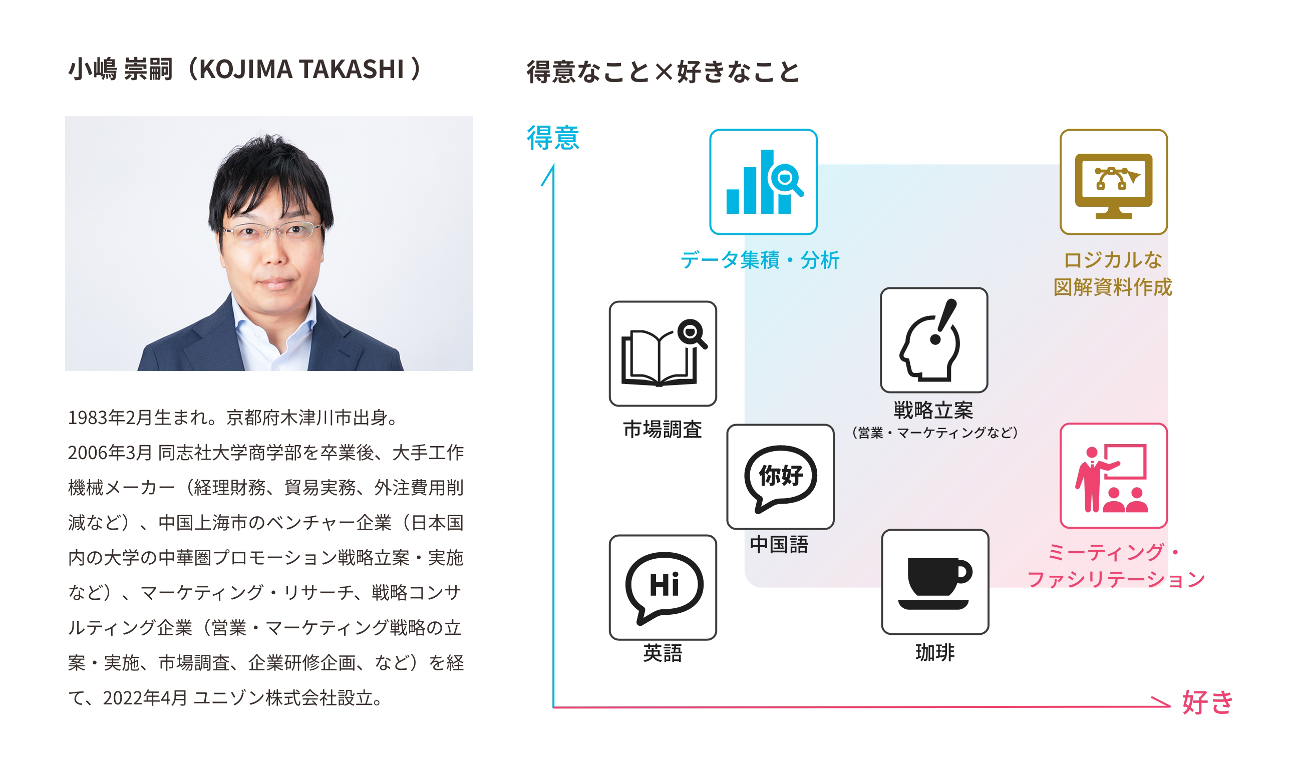 2006年3月 同志社大学商学部を卒業後、大手工作機械メーカー(経理財務、貿易実務、外注費用削減など)、中国上海市のベンチャー企業(日本国内の大学の中華圏プロモーション戦略立案・実施など)、マーケティング・リサーチ、戦略コンサルティング企業(営業・マーケティング戦略の立案・実施、市場調査、企業研修企画、など)を経て、2022年4月 ユニゾン株式会社設立。